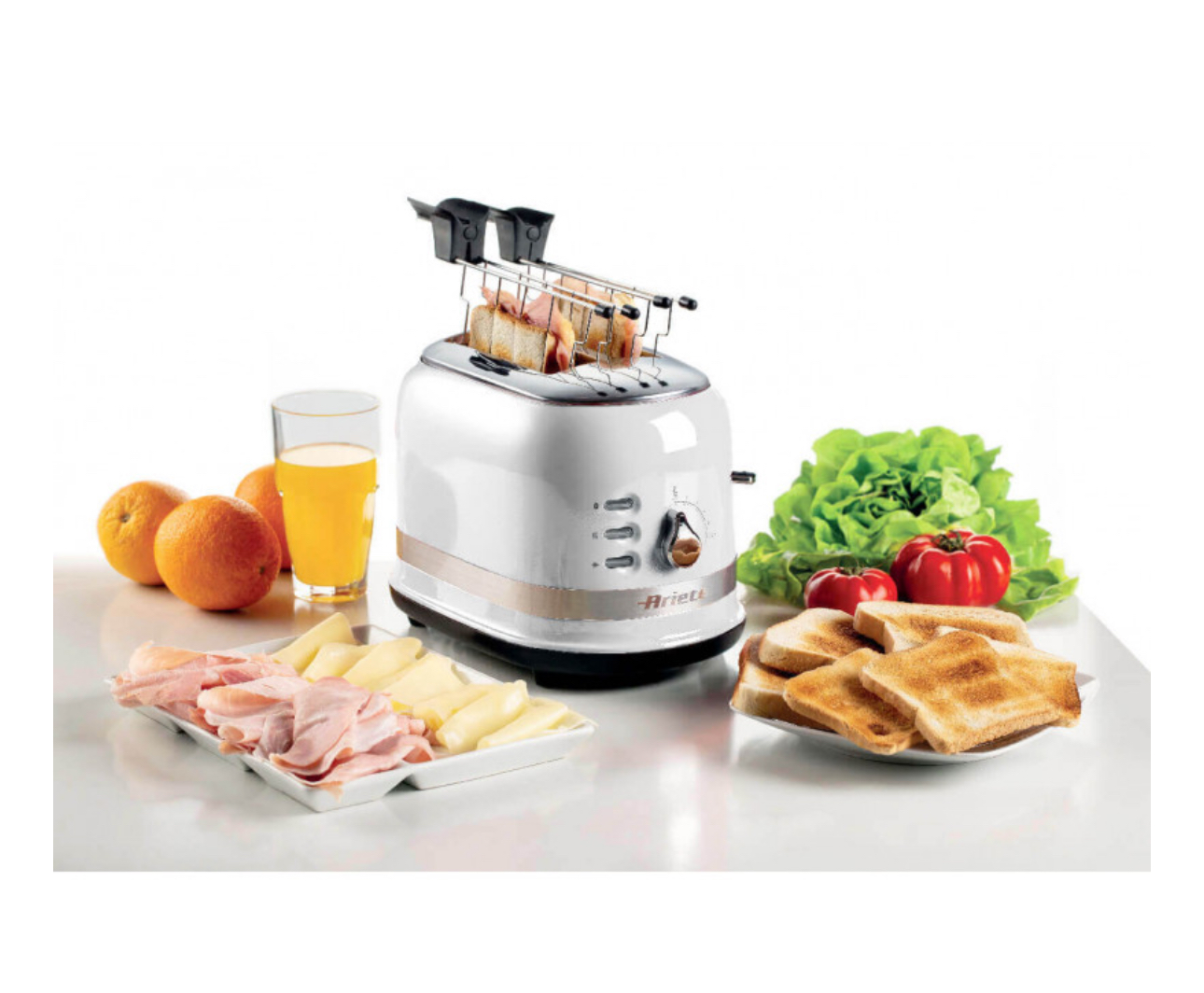 توستری با طراحی که زیبایی و کارایی را با هم ترکیب میکند تا نان یا ساندویچهای پر شده را به طور کامل برشته کند. ۲ برش نان به همراه انبر. ۶ سطح برشته کردن. عملکردها: پخت، گرم کردن مجدد، یخزدایی. سفید