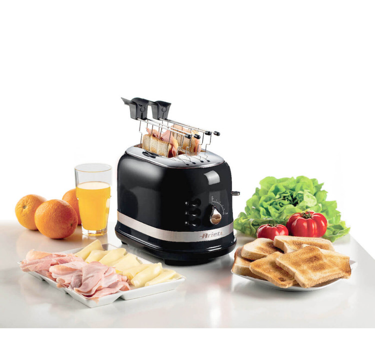 توستری با طراحی که زیبایی و کارایی را با هم ترکیب میکند تا نان یا ساندویچهای پر شده را به طور کامل برشته کند. ۲ برش نان به همراه انبر. ۶ سطح برشته کردن. عملکردها: پخت، گرم کردن مجدد، یخزدایی. مشکی