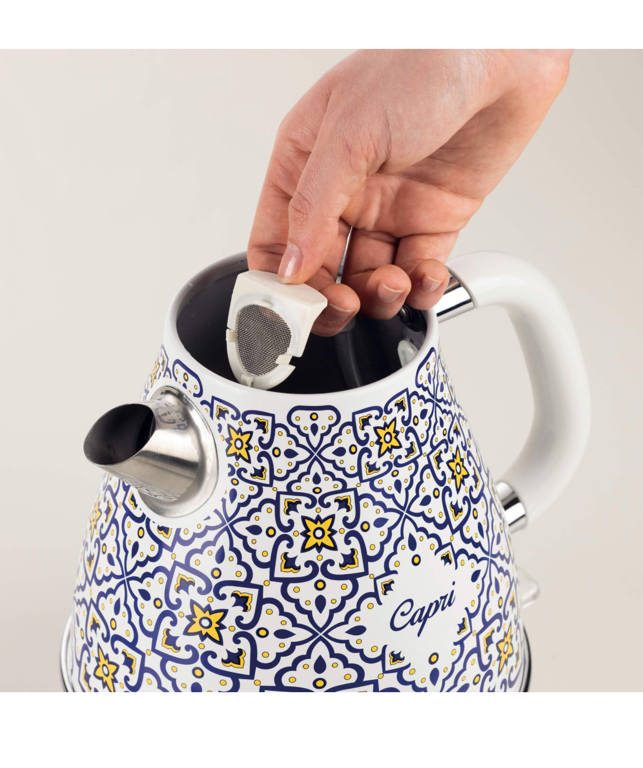 کتری برقی کاپری با طراحی موجدار و ظریف خود، هنر و فرهنگ مدیترانهای را تداعی میکند و با پایه بیسیم و ظرفیت ۱.۷ لیتری ، صبحانه یا استراحت عصرگاهی را دلچسبتر میکند. کتری برقی کاپری یک همراه واقعی برای دوستداران چای، دمنوشهای گیاهی و نوشیدنیهای گرم است.