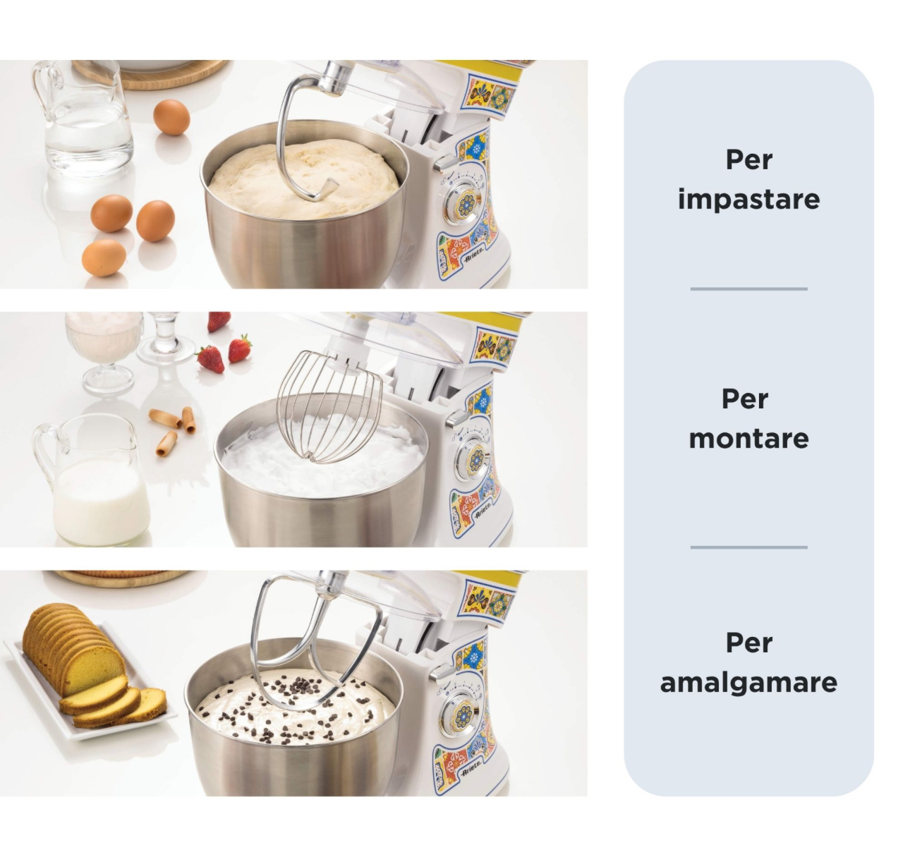 با همزن سیارهای کاپری، مخلوط کنید، مخلوط کنید، هم بزنید : با ۳ لوازم جانبی ارائه شده (قلاب، همزن و همزن سیمی)، هیچ محدودیتی برای کارهایی که میتوانید در آشپزخانه انجام دهید وجود ندارد. با قلاب، میتوانید سختترین دستور العملها مانند خمیر پیتزا یا نان یا شیرینیهای ترد را ورز دهید؛ همزن برای مخلوط کردن و تهیه خامه و پایههای کیک پفکی ایدهآل است، در حالی که با همزن سیمی میتوانید هر مادهای مانند تخم مرغ یا خامه را به سرعت هم بزنید.
