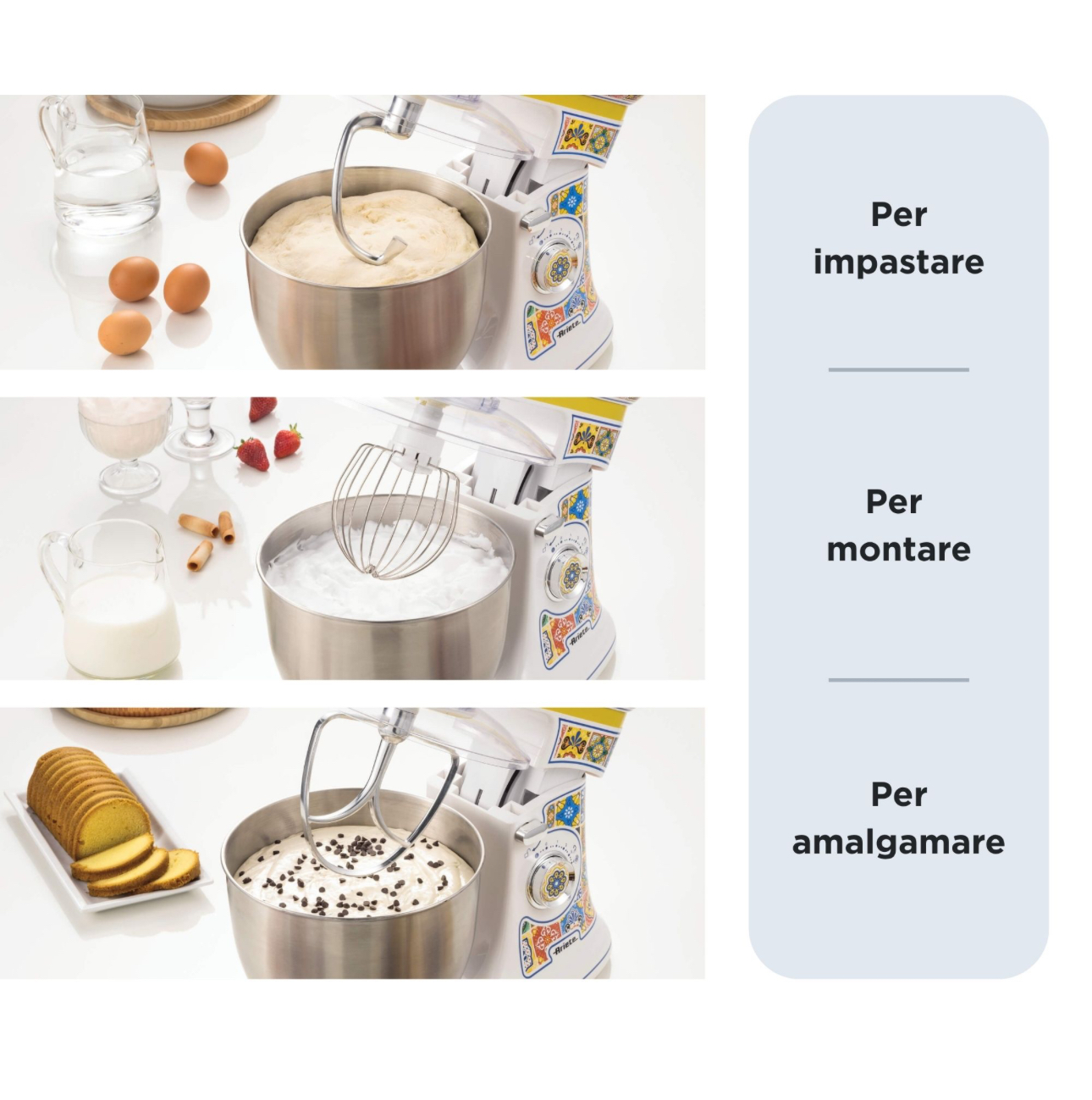 با همزن سیارهای Positano مخلوط کنید، مخلوط کنید، هم بزنید : با 3 لوازم جانبی ارائه شده (قلاب، همزن و همزن سیمی)، هیچ محدودیتی برای کارهایی که میتوانید در آشپزخانه انجام دهید وجود ندارد. با قلاب، میتوانید سختترین دستور العملها مانند خمیر پیتزا یا نان یا شیرینیهای ترد را ورز دهید. همزن برای مخلوط کردن و تهیه خامه و پایههای کیک پفکی ایدهآل است، در حالی که با همزن سیمی میتوانید هر مادهای مانند تخم مرغ یا خامه را به سرعت هم بزنید.