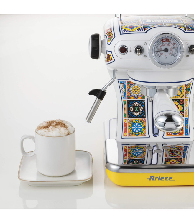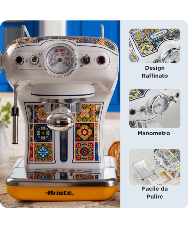 دستگاه اسپرسوسازآریته سری وینتیج رنگ پوزیتانو برای پودر قهوه و کپسولهای ESE. فیلتر ۱ و ۲ فنجانی، به همراه همزن شیر برای هم زدن شیر داغ.