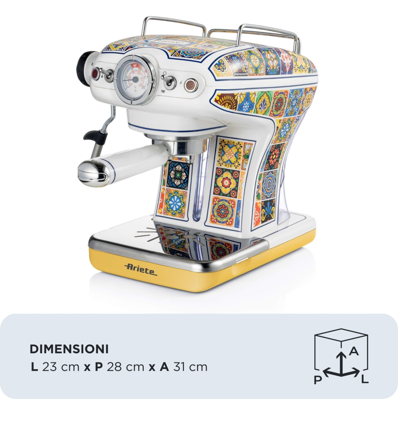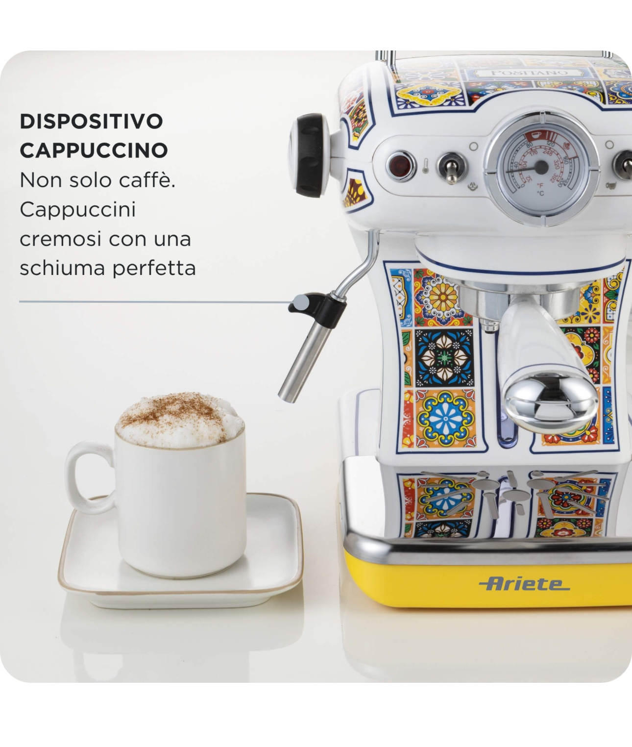 دستگاه اسپرسوسازآریته سری وینتیج رنگ پوزیتانو برای پودر قهوه و کپسولهای ESE. فیلتر ۱ و ۲ فنجانی، به همراه همزن شیر برای هم زدن شیر داغ.