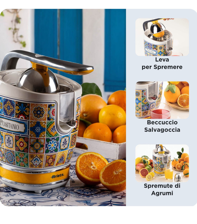 قدرتمند، بیصدا و با طراحی زیبا: آبمیوهگیری برقی پوزیتانو با بدنه فلزی و روکش کرومی خود ، سبکی درخشان به آشپزخانه شما میبخشد و جوهره پوزیتانو را تداعی میکند .