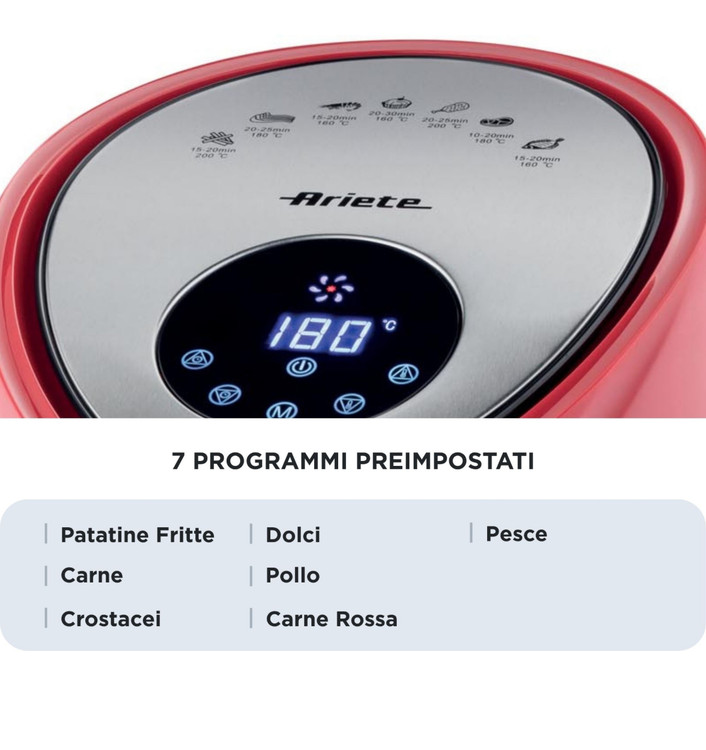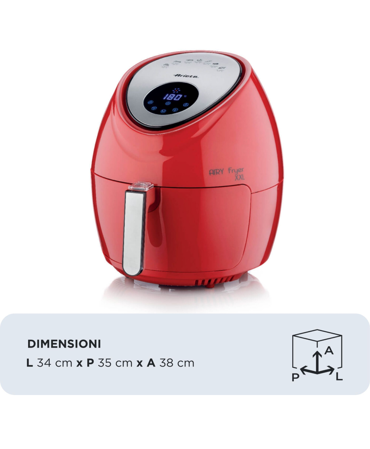 سرخکن بدون روغن Airy Fryer XXL از برند Ariete، میتوانید هر غذایی را، حتی در مقادیر زیاد، تنها با یک قاشق غذاخوری روغن سرخ کنید تا همزمان سرخ کردنی سالم و خوشمزهای داشته باشید. به لطف سبد ۵.۶ لیتری XXL همراه با Airy Fryer XXL از برند Ariete، میتوانید تا 2.5 کیلوگرم سیبزمینی سرخکرده را در یک مرحله بپزید! سیبزمینی سرخکرده، اما نه تنها سیبزمینی سرخکرده، بلکه کروکت، ماهی، گوشت و بسیاری از غذاهای سوخاری دیگر، چه منجمد و آماده سرخ کردن، و چه تازه و فقط سوخاری شده، به لطف 7 حالت پخت از پیش تعیین شده.