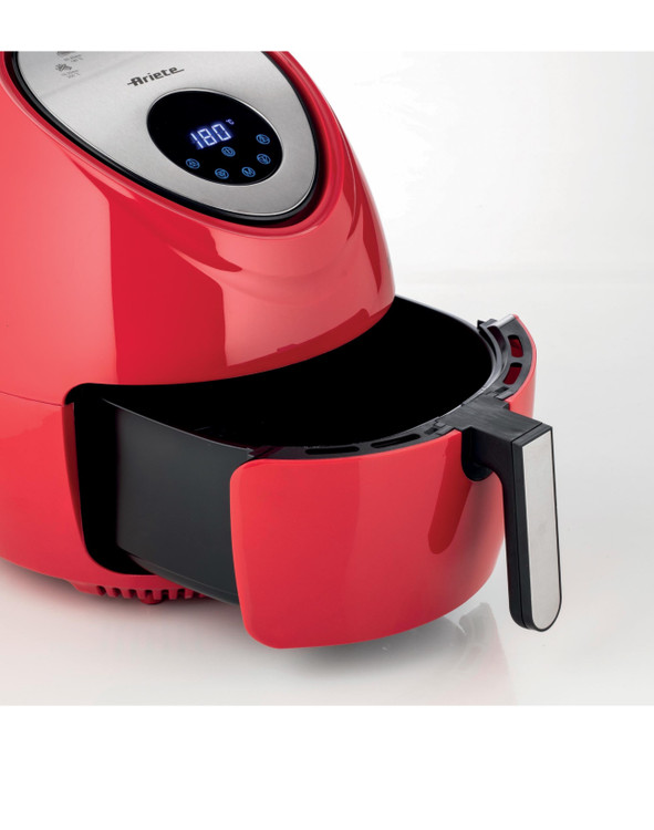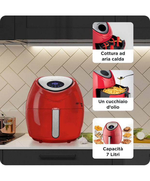 سرخکن بدون روغن ۵.۶ لیتری. با هوای داغ میپزد، بدون بو سرخ میکند، با یک قاشق غذاخوری روغن تا ۲.۵ کیلوگرم سیبزمینی سرخکرده را همزمان سرخ میکند. دمای قابل تنظیم حداکثر ۲۰۰ درجه. قرمز
